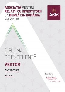 “Anul 2020 a fost un an atipic, datorat pandemiei, în care a trebuit să ne adaptăm rapid și să abordăm noi strategii de comunicare proactivă cu toți stakeholderii noștri. Fiind o prioritate pentru noi, am continuat să dezvoltăm o comunicare onestă și transparentă, să implementăm cele mai bune practici în relația cu investitorii și acționarii noștri. Ne bucurăm că pentru al doilea an consecutiv ne situăm în fruntea clasamentului Vektor. Consider că reprezintă o recunoaștere a preocupării constante a Antibiotice față de toți jucătorii din piața de capital, a modului etic și responsabil în care își prezintă activitatea”, a declarat Mihaela Obreja, Manager managementul riscului și relații cu investitorii, Antibiotice.
