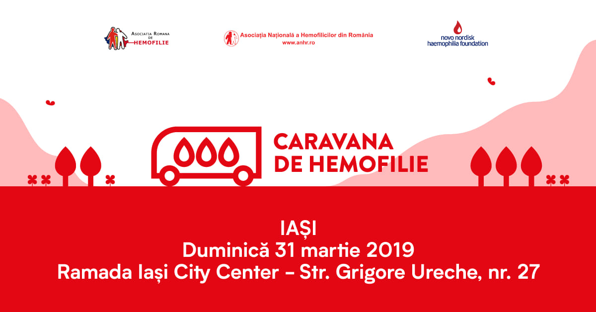 Caravana va continua cu o nouă oprire la Iași, duminică, 31 martie 2019, la Hotel Ramada, unde începând cu ora 10.30 veți avea ocazia de a afla tot ce vă interesează despre hemofilie, tratamente, cum puteți să gestionați această afecțiune pentru voi sau cei dragi.