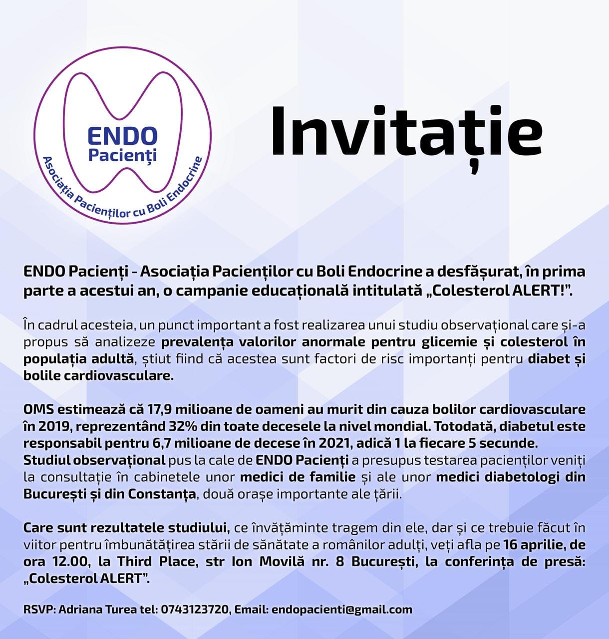 ENDO pacienți – Asociatia Pacientilor cu Boli Endocrine organizează primul eveniment din cadrul campaniei ”Colesterol Alert!”, marti, 16 aprilie, de la ora 12, la Third Place, str Ion Movilă nr. 8 București. ( locaţia este vis a vis de spitalul Cantacuzino.