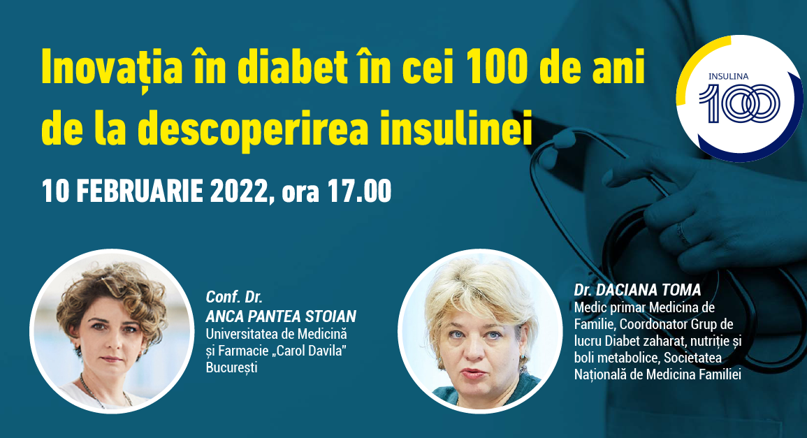 Comunitatea RoDiabet discută joi, 10 februarie 2022, de la ora 17.00 despre lungul drum al inovațiilor în diabet, de la momentul extraordinar al descoperirii insulinei din anul 1821 și până la excepționalele terapii și tehnologii actuale. Webinarul este dedicat medicilor de familie și are ca invitați speciali pe diabetologul conf. dr. Anca Pantea Stoian de la UMF Carol Davila din București și dr. Daciana Toma, medic primar de medicina familiei și coordonator al Grupului de lucru Diabet zaharat al SNMF.