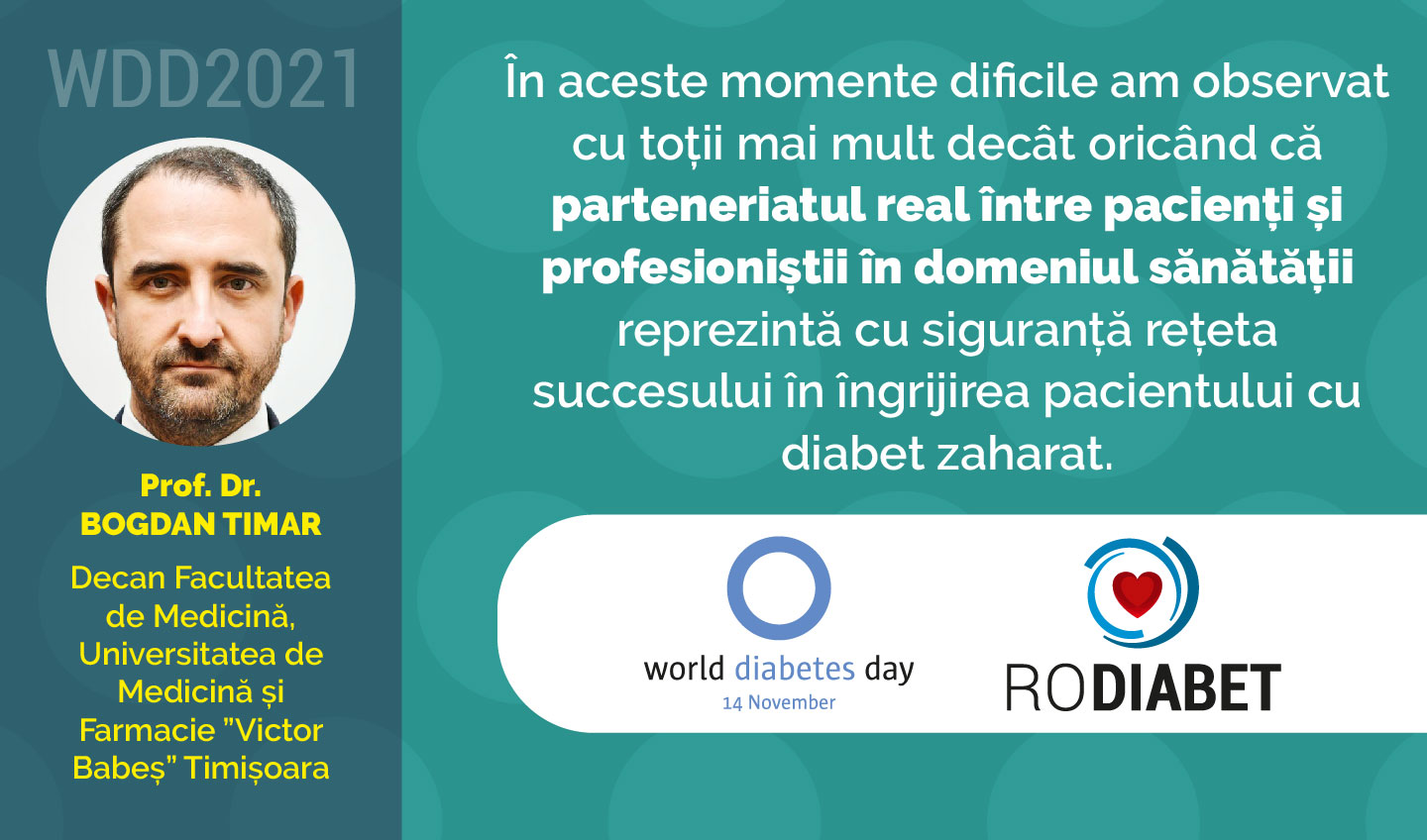 ”Întreaga omenire trece printr-o perioadă nemaiîntâlnită generațiilor actuale, marcată de particularitățile generate de pandemia de COVID-19. Este o perioadă de grea încercare pentru noi toți dar mai cu seamă pentru persoanele cu diabet zaharat, deoarece consecințele pandemiei fac cu atât mai dificilă îngrijirea diabetului în special și a sănătății în general. În aceste momente dificile am observat cu toții mai mult decât oricând că parteneriatul real între pacienți și profesioniștii în domeniul sănătății reprezintă cu siguranță rețeta succesului în îngrijirea pacientului cu diabet zaharat.