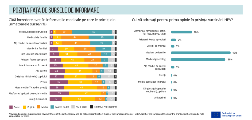 În ceea ce privește încrederea în decizia de vaccinare, ginecologii și medicii de familie sunt preferați de 62%, respectiv 55% dintre respondenți. Totodată, 52% au fost informați anterior despre necesitatea vaccinării, iar 7 din 10 se simt capabili să găsească informații de încredere despre vaccin; 6 din 10 declară că știu unde să se programeze.