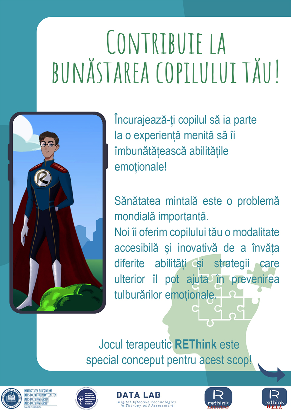 Laboratorul Digital Affective Technologies in Therapy and Assessment din cadrul International Institute for the Advanced Studies of Psychotherapy and Applied Mental Health, Facultatea de Psihologie și Științe ale Educației, Universitatea Babeș-Bolyai desfășoară un studiu de cercetare experimental care își propune să testeze un joc mobil terapeutic (REThink) cu scopul de a preveni apariția tulburărilor emoționale în rândul copiilor cu vârsta cuprinsă între 8-16 ani cu o boală fizică cronică.